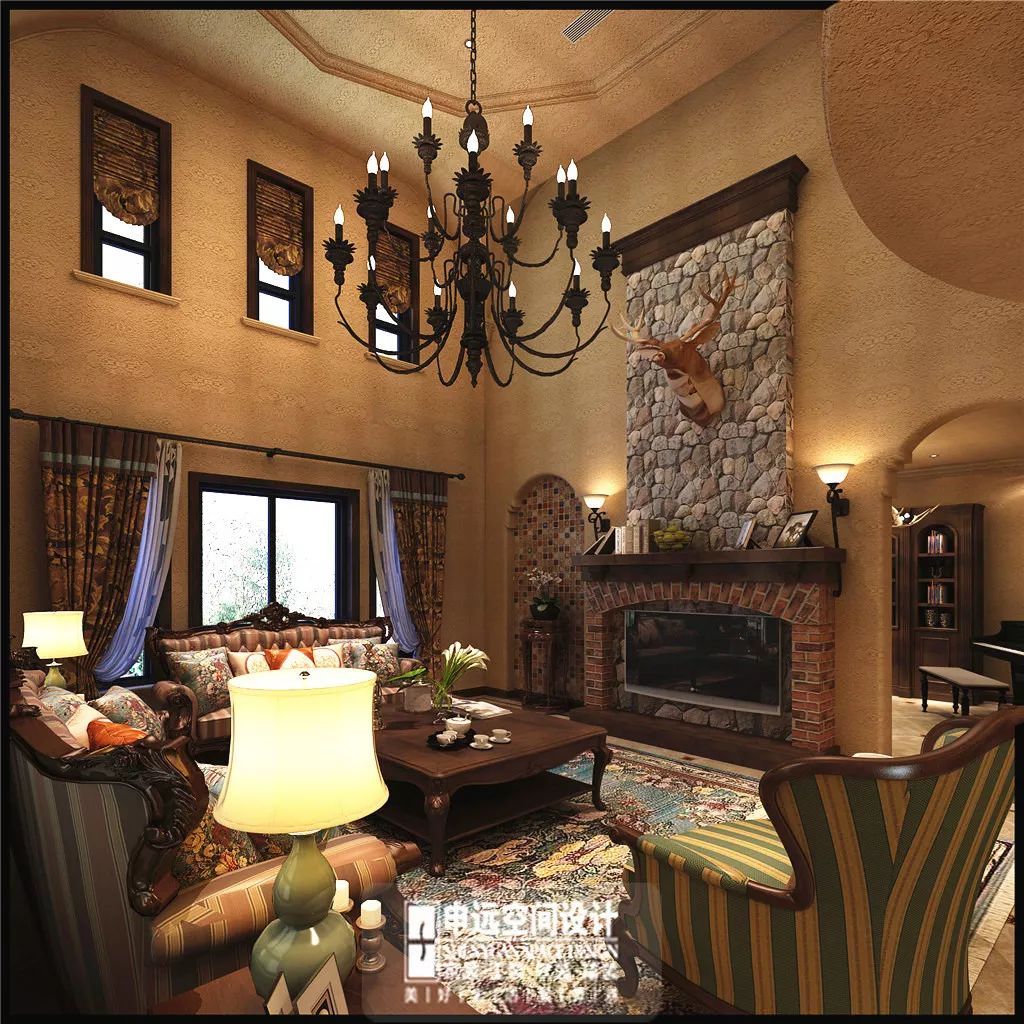 石材打造而成的复古壁炉,较之现代壁炉更具特色,圆形的铁艺装饰悬挂其上,精致的图案犹如部落的图腾,传承历史文化。 ▼